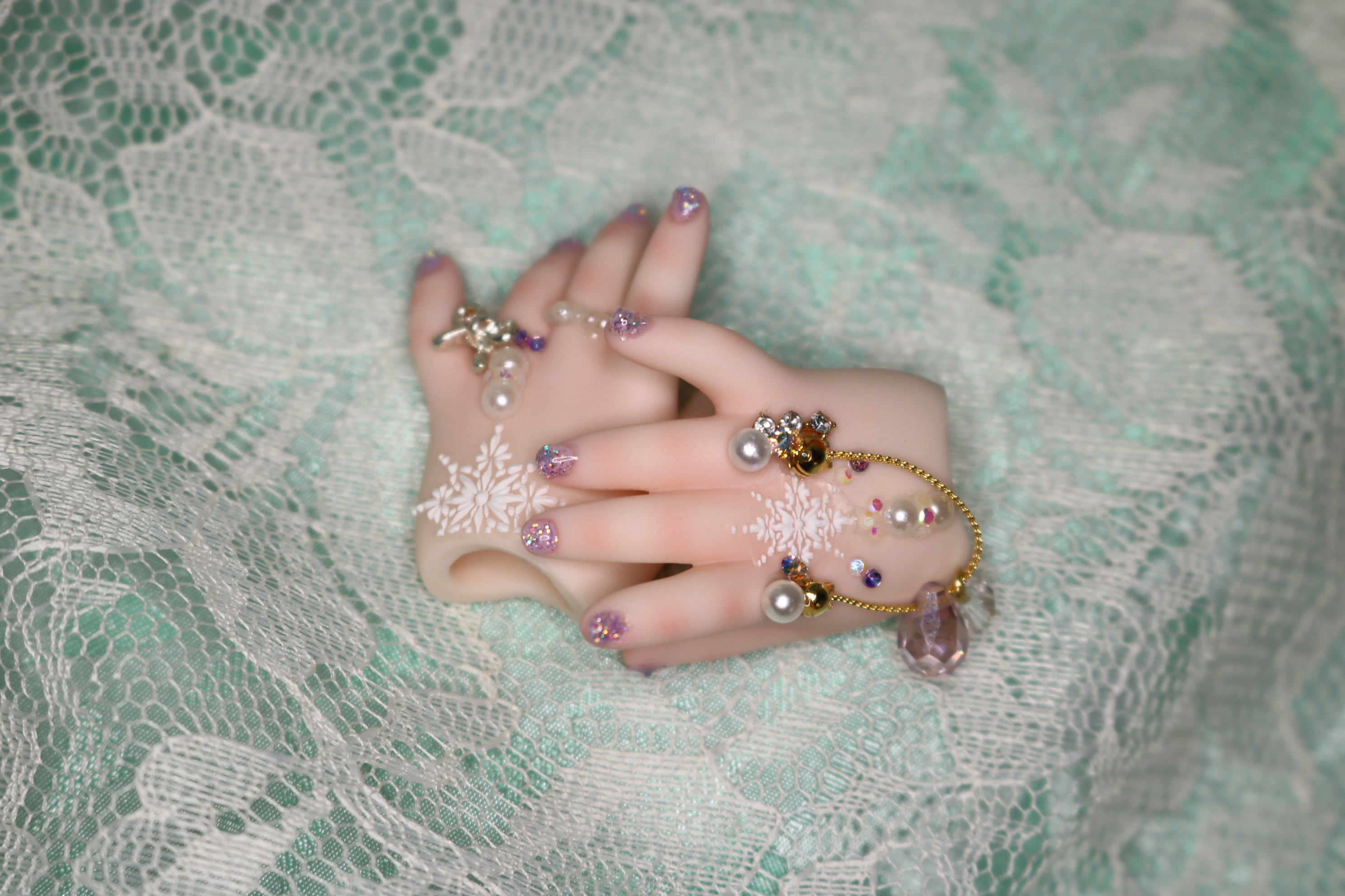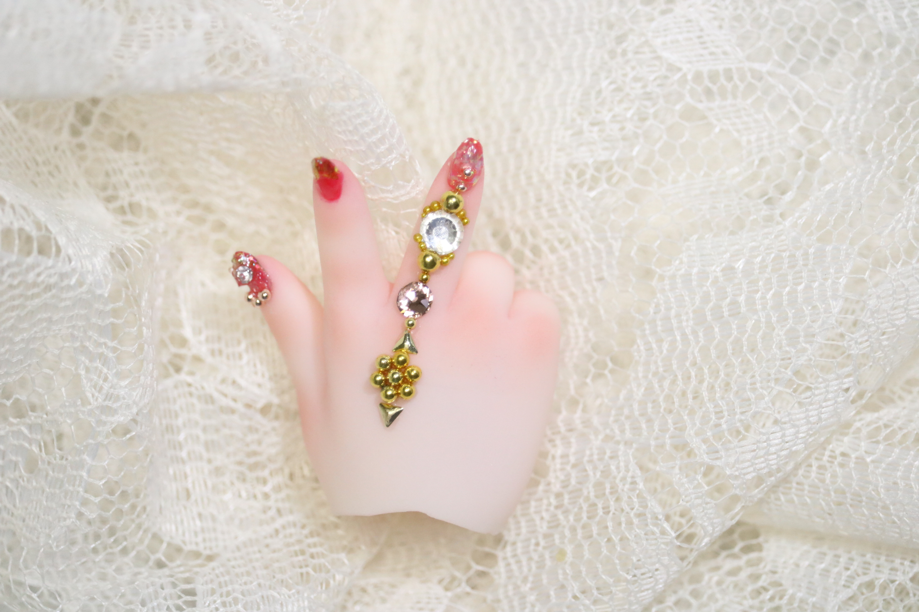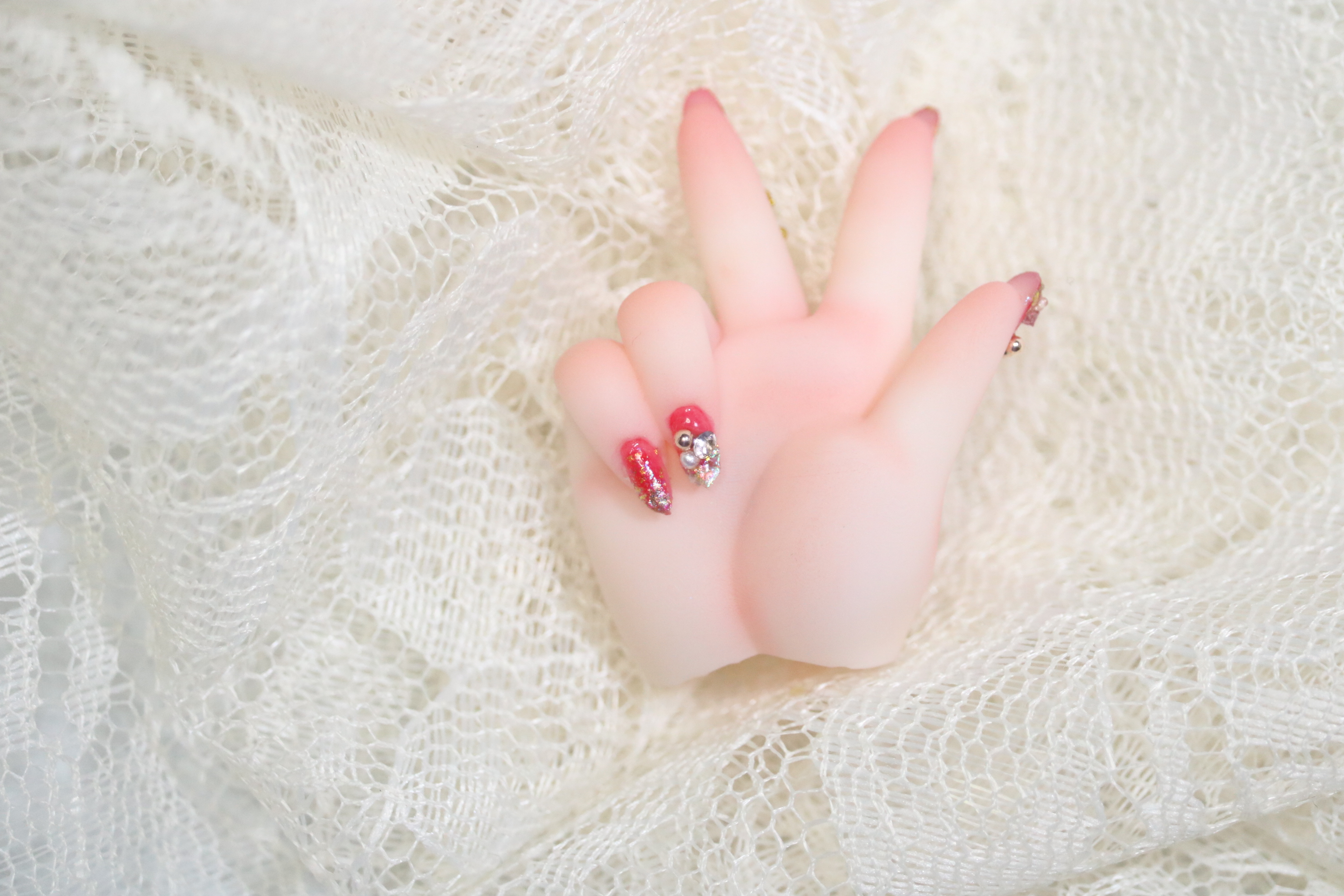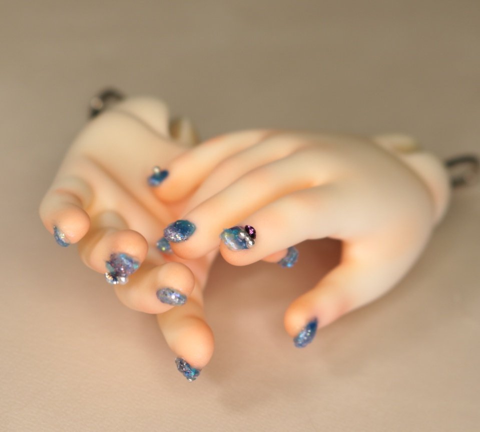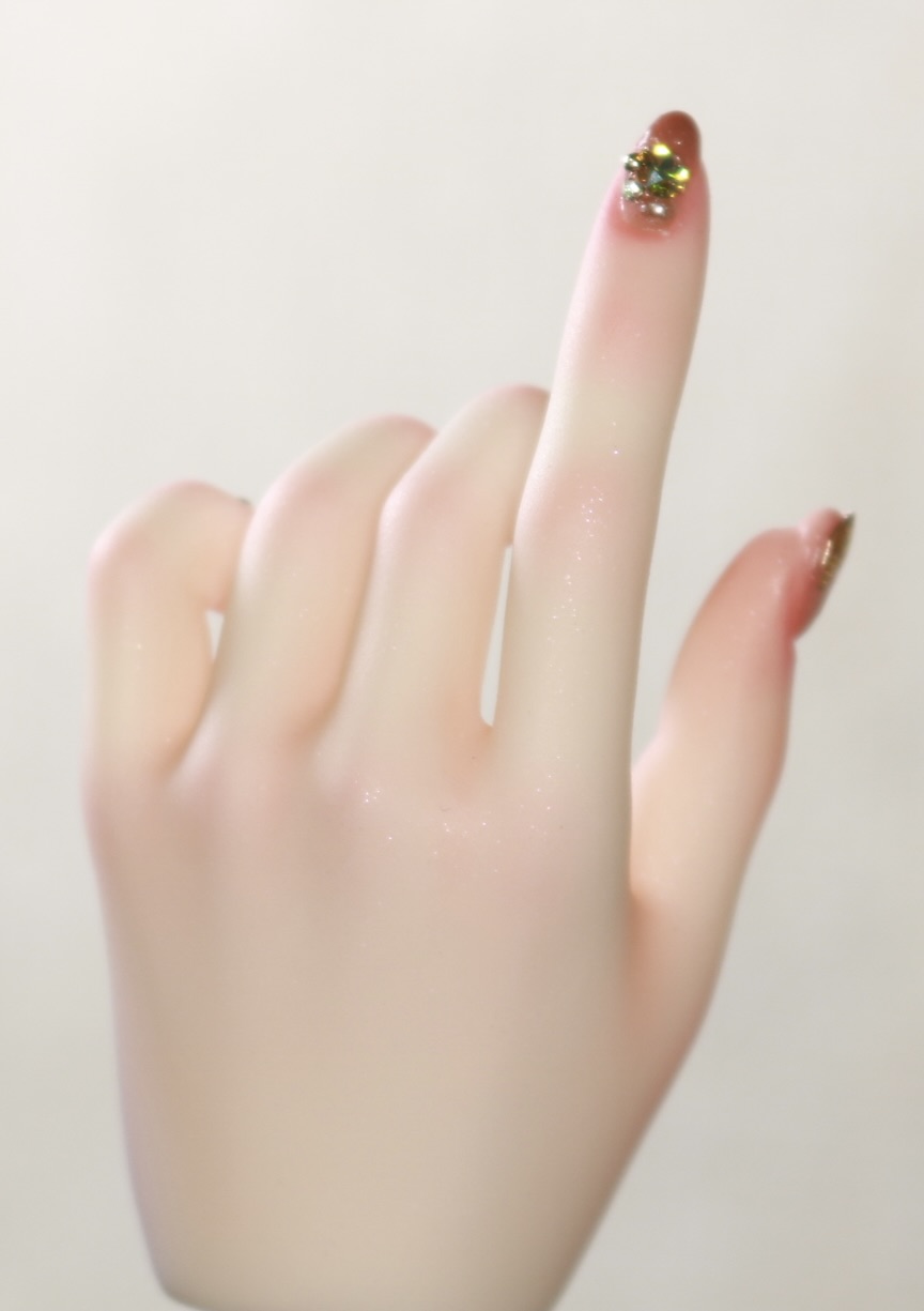 装飾マシマシSプランは、豪華な装飾を爪だけに施すためのプランでしたが、LUTSさんのハンドパーツですと爪が小さくてどうしても物足りない感じになってしまったため急遽爪の長さを出して装飾を施しました。